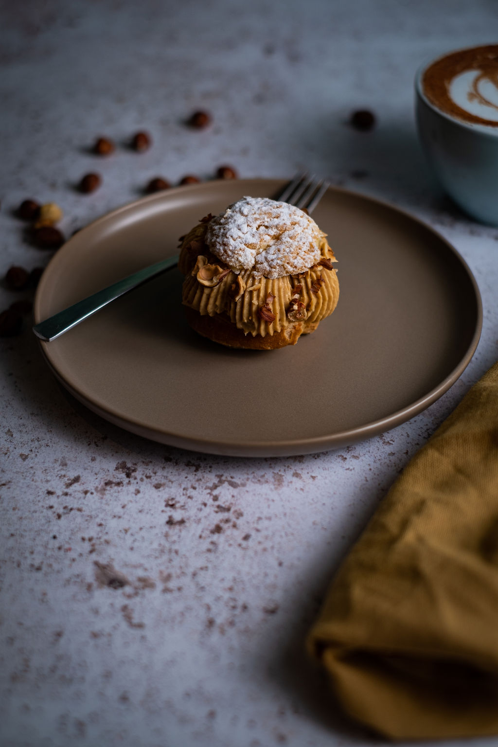 Chou craquelin, cœur noisette et crumble, crème praliné, crémeux passion
