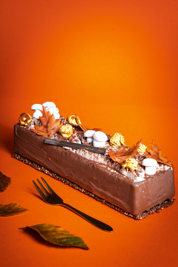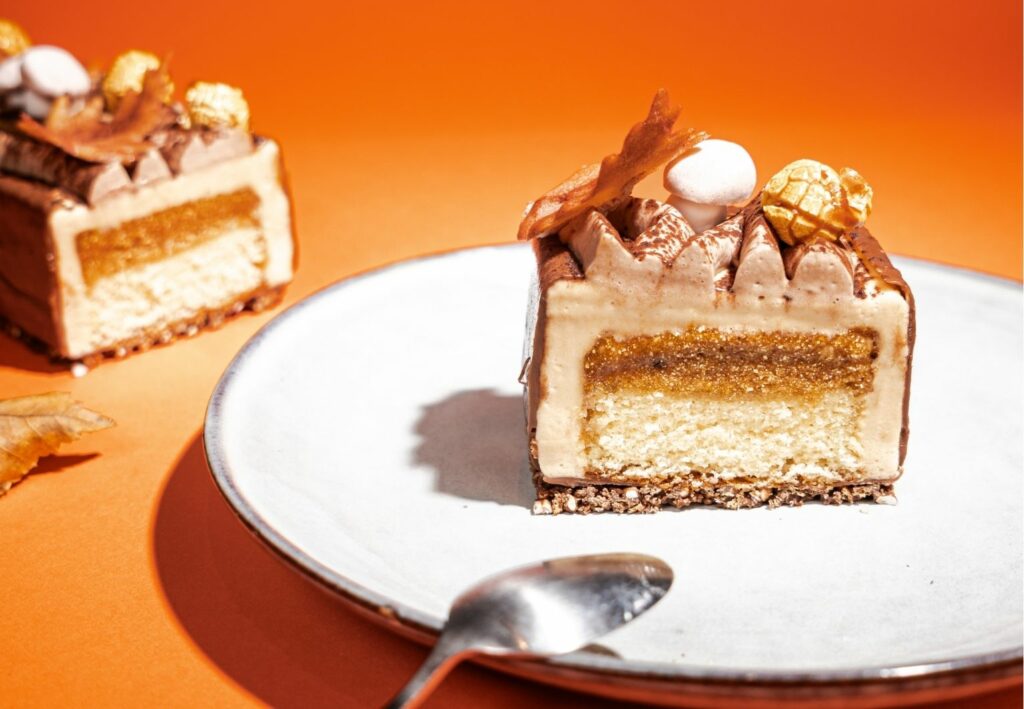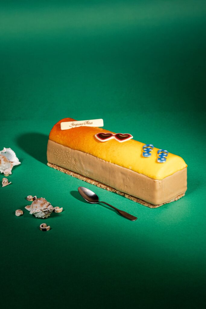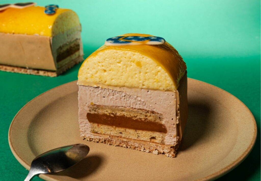 Bavaroise mangue passion, confit mangue et piment d’espelette, ganache lait et amande, biscuit amande, croustillant diamant.