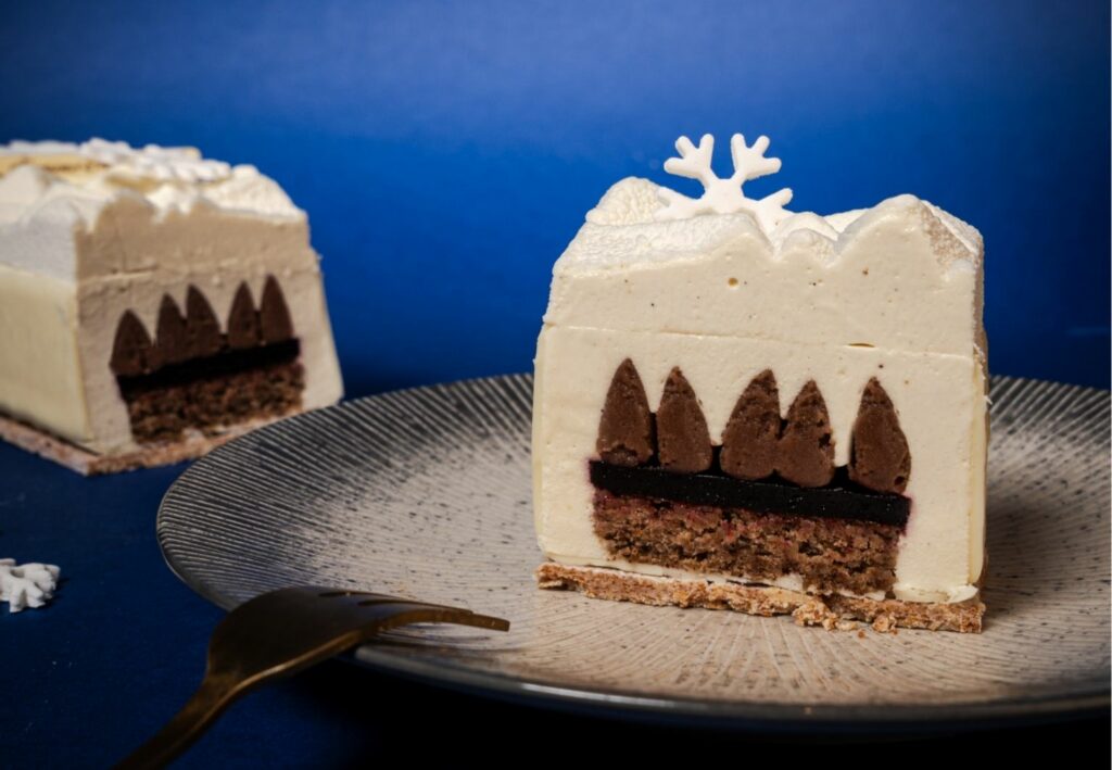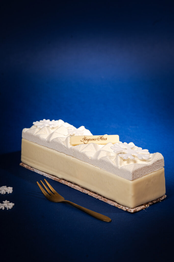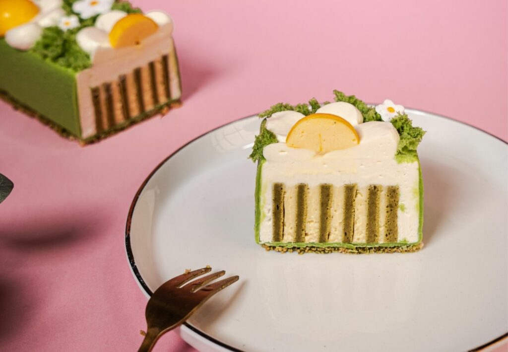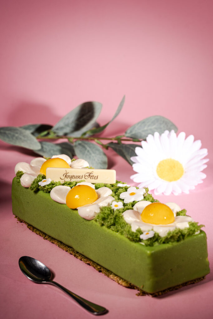 Ganache coco chocolat blanc, biscuit japonais matcha, crémeux citrons et kalamansi, croustillant crumble coco et matcha, sponge cake matcha.