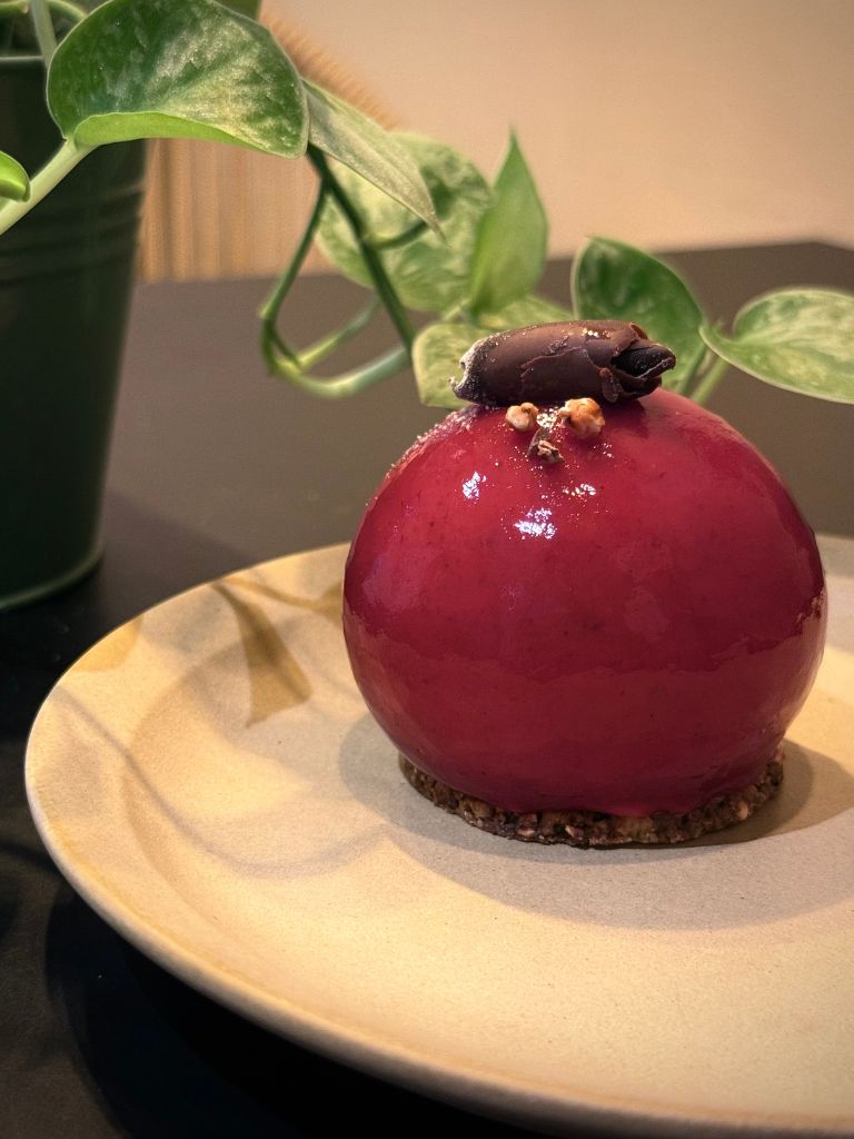 Sablé breton, ganache émulsionnée chocolat blanc crème cheese, composée de fruits frais de saison.